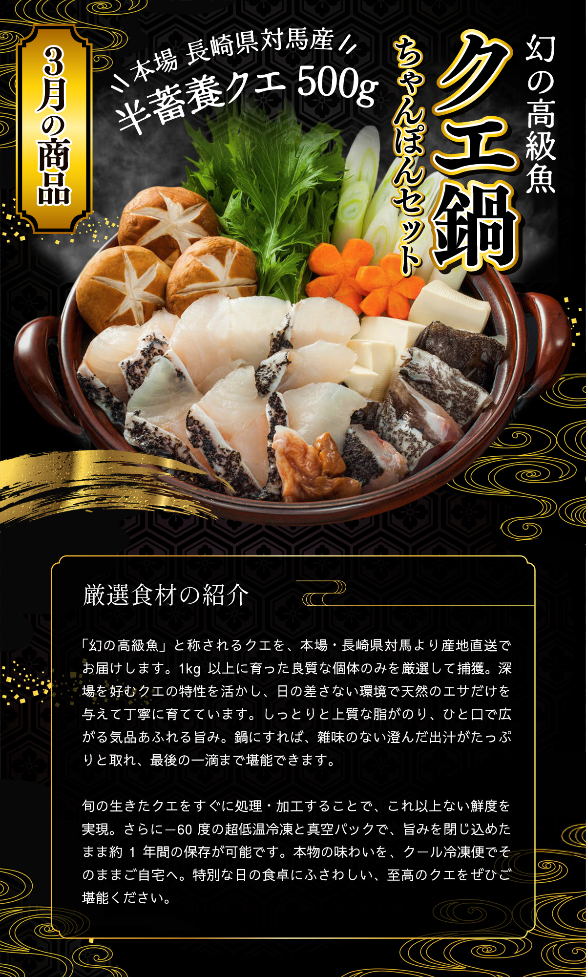 3月配送分では「幻のクエ」をお届け。本場九州の長崎県対馬で鮮度抜群の状態から加工してお届けする贅沢な鍋セット。